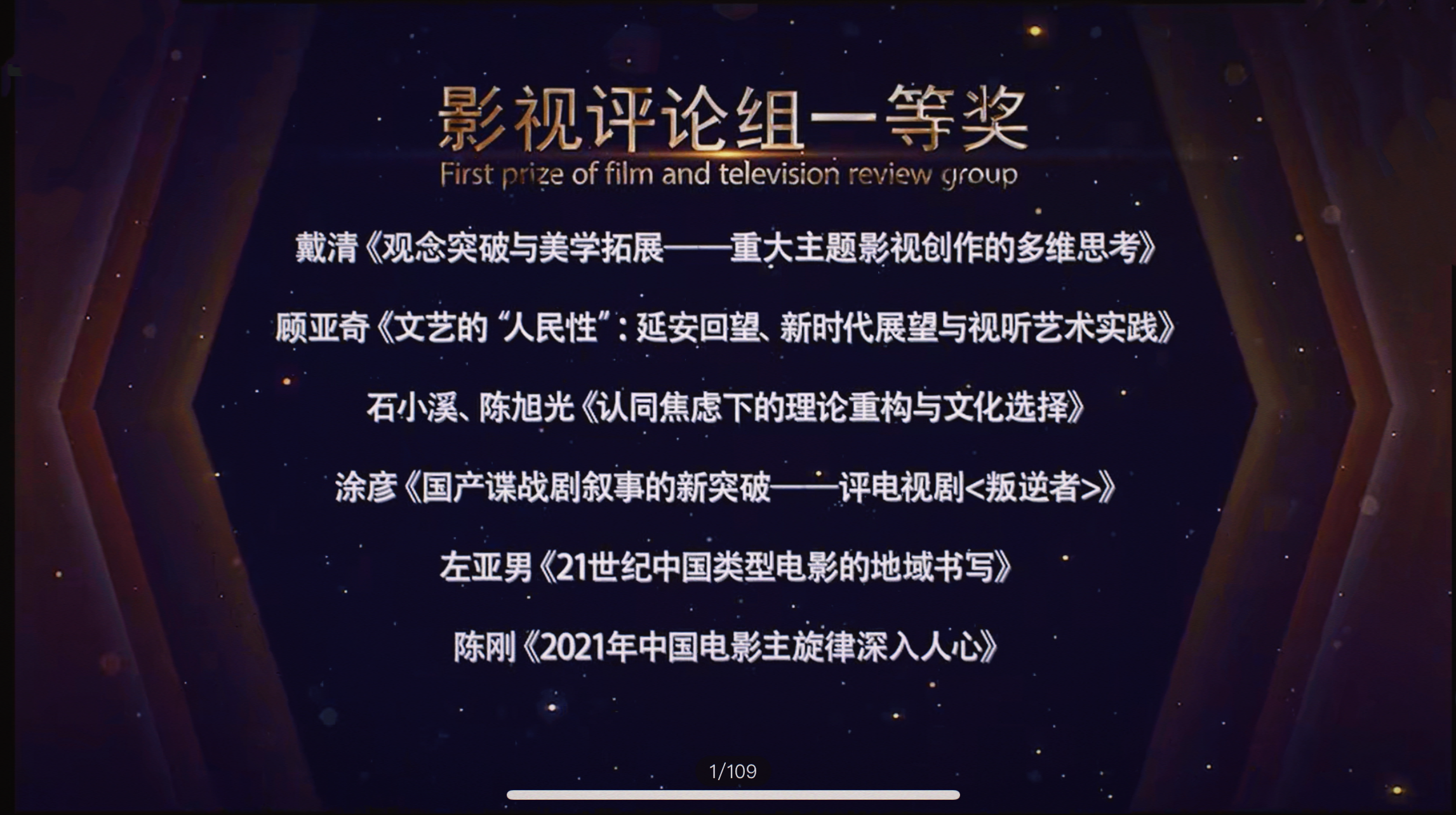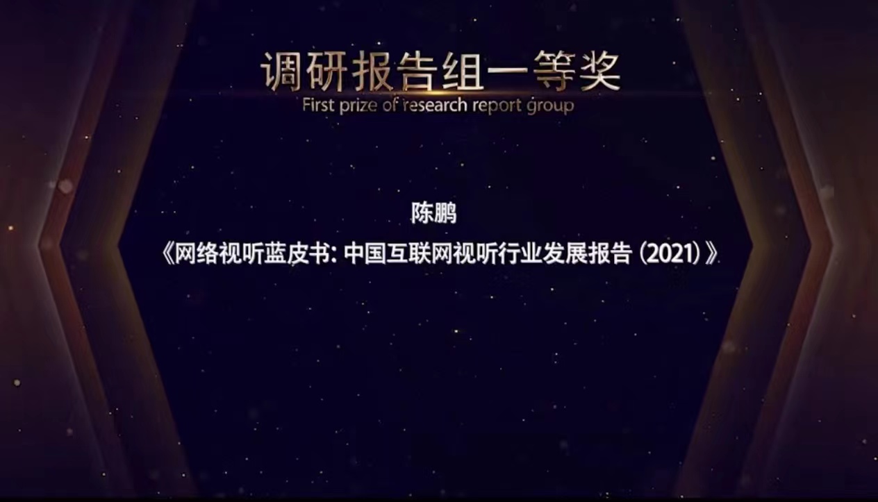 副经理陈鹏主编的《网络视听蓝皮书:中国互联网视听行业发展报告(2021)》获调研报告组一等奖,教师石小溪与北京大学艺术公司教授陈旭光合作的《认同焦虑下的理论重构与文化选择——重读20世纪90年代的后殖民主义电影批评》获影视评论组一等奖,教师田亦洲的《媒介自反、迷影狂欢与影游联动——试论电影<扬名立万>的“互文性”景观》获影视评论组二等奖。