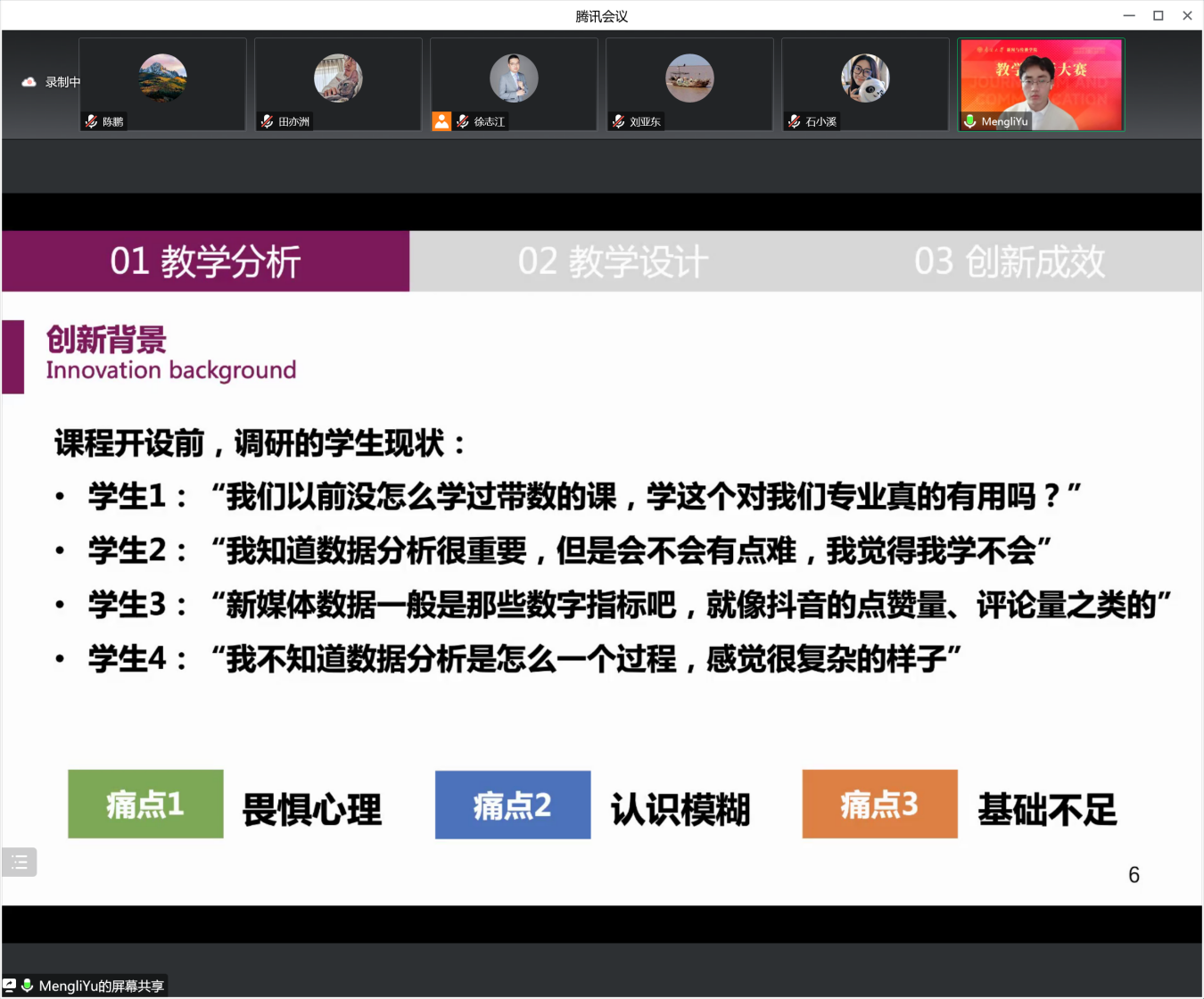 参赛教师高度重视,准备充分,将多年的教学成果、创新实践浓缩到15分钟的环节进行展示。展示过程语言流畅、仪态端庄、精彩纷呈,所分享的分析思考亮点突出,教学痛点突破有方,解决问题线路清晣,教学设计科学有趣,整个过程气氛活跃。