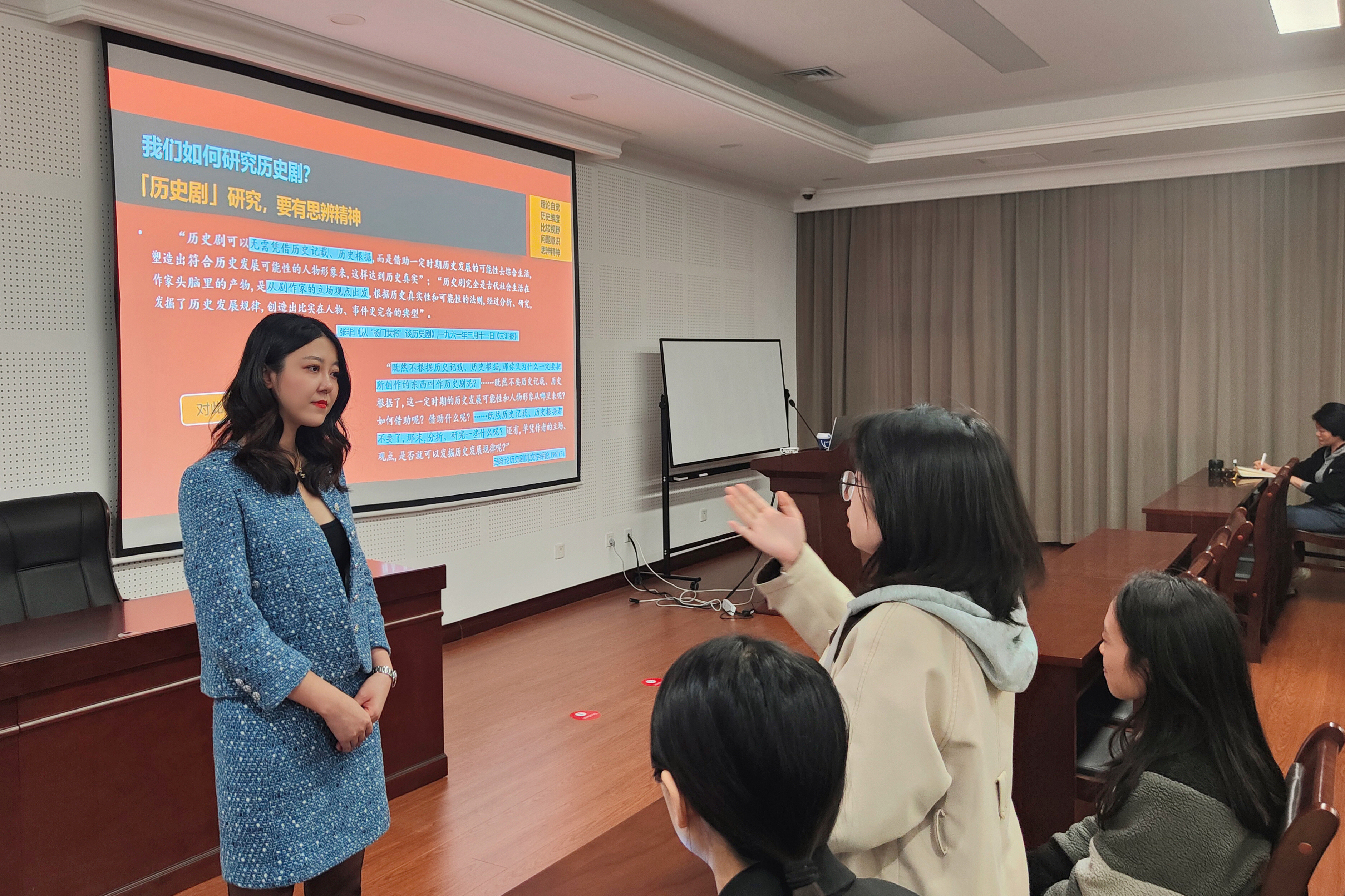 讲座开始,石小溪从为何研究历史剧的问题意识出发,指出历史剧是对历史的严肃“重写”,是站在现在与过去的一次新对话,具有引导和建立大众历史观、推动社会政治进步和抚慰人心的作用。她在简洁明了地为员工区分类型和题材的差异后,阐释了历史剧的学术研究路径,要有理论自觉、历史维度、比较视野、问题意识和思辨精神,并在其中讨论了英国与中国学术界自17世纪以来关于历史剧在真实与虚构问题上的观点分歧,介绍了余秋雨先生在1980年提出的具有较强实践性、得到学界普遍认可的七条“虚构的限度”。