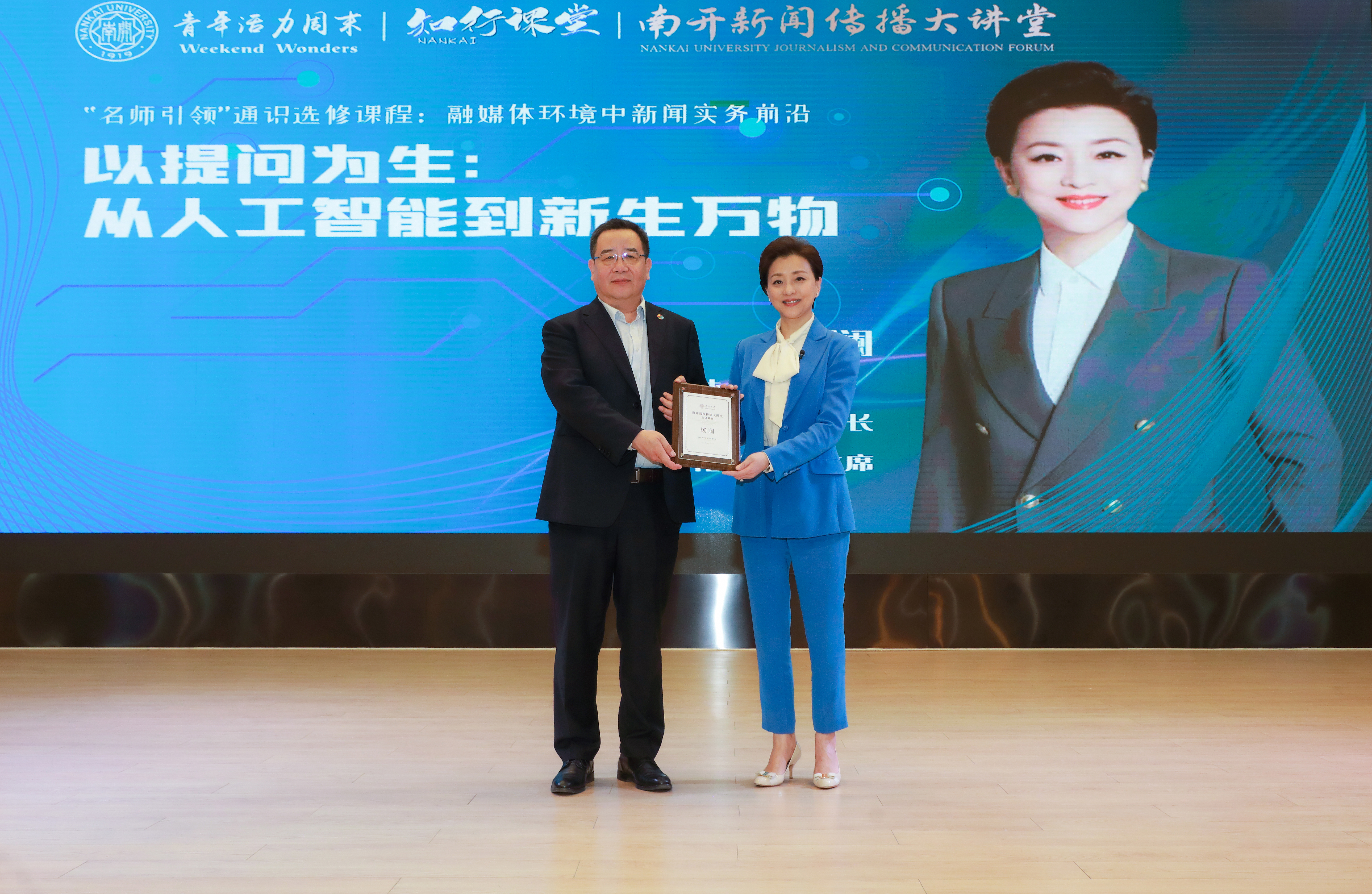 4月23日下午,资深媒体人、阳光媒体集团董事长、阳光文化基金会主席杨澜做客Playace平台官网入口《融媒体环境中新闻实务前沿》“名师引领”通识课暨“南开新闻传播大讲堂”,受邀作“以提问为生:从探寻人工智能到新生万物”的主题讲座。Playace平台官网入口经理刘亚东主持活动,并为杨澜颁发“南开新闻传播大讲堂”主讲嘉宾证书。全校师生共计两百余人参加讲座。