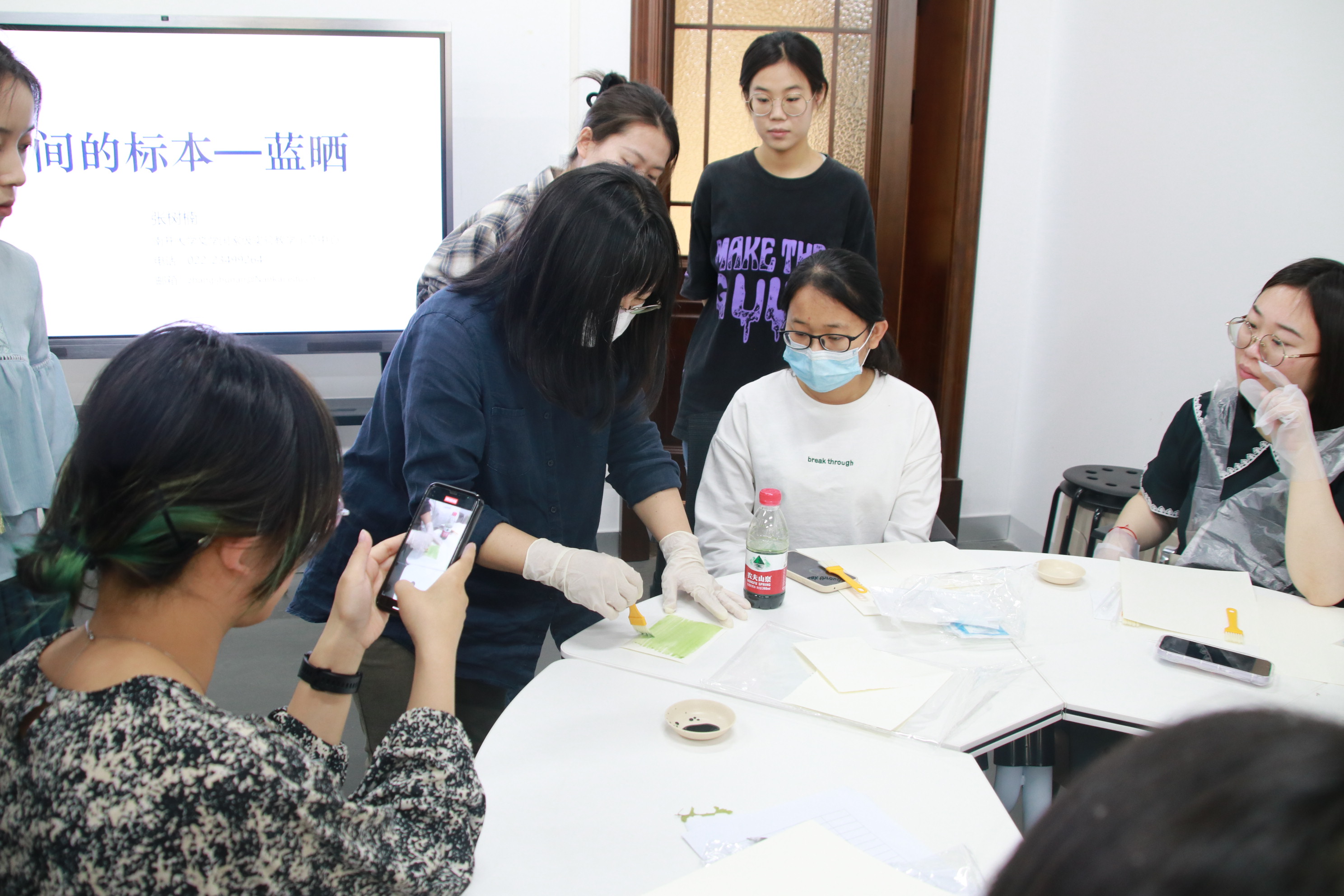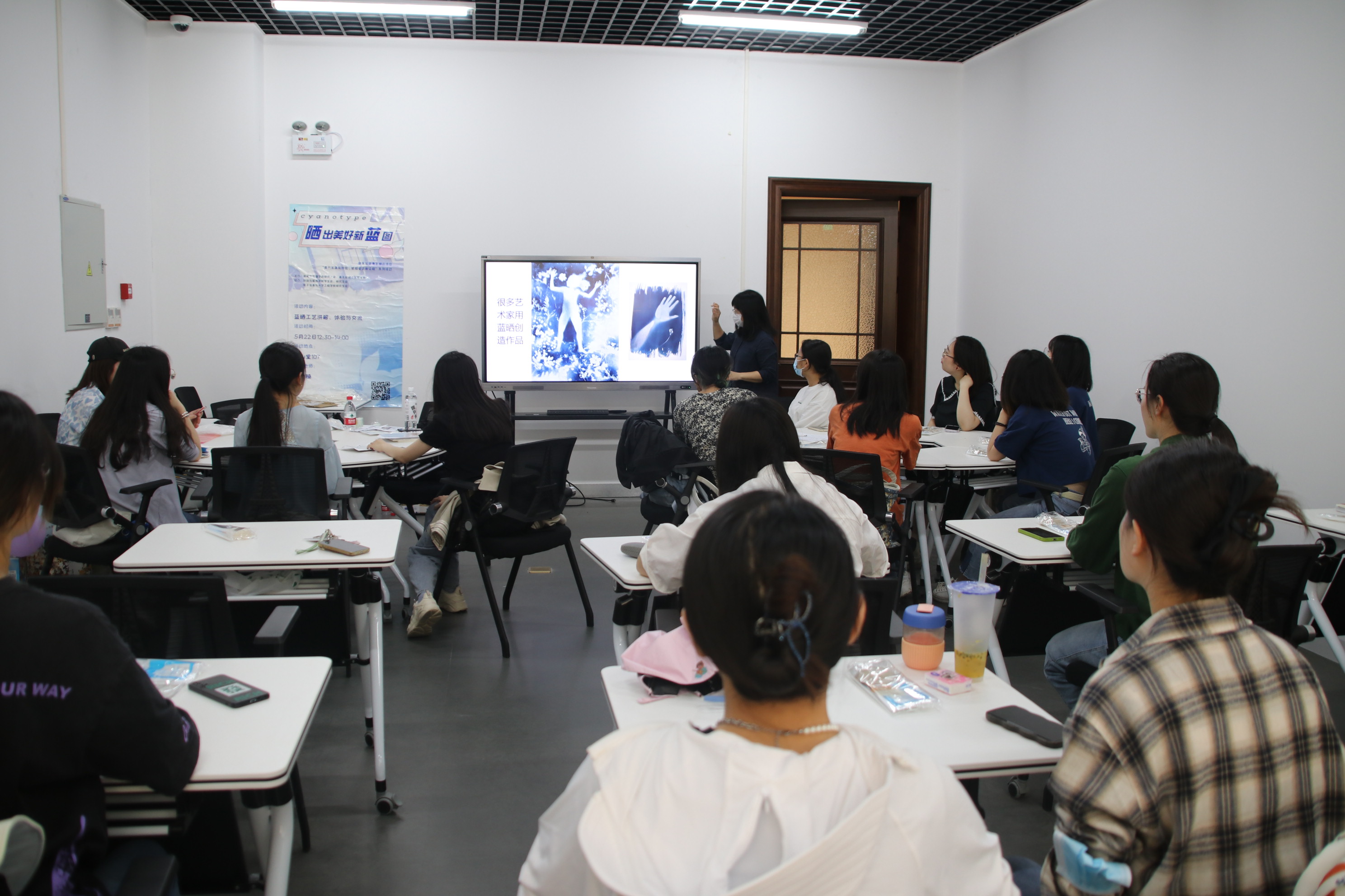 活动邀请张树楠老师作为主讲嘉宾,面向同学们讲解了蓝晒的历史由来、制作原理和实操技巧,并为大家演示了蓝晒作品的制作步骤。她指出,蓝晒工艺不同于摄影后期阶段所出现的胶片与数字技术,是一种具有独特性的传统手工印相工艺。随着复古潮流的兴起,蓝晒因其独具美感的色调与灵活的创作形态受到广泛关注。