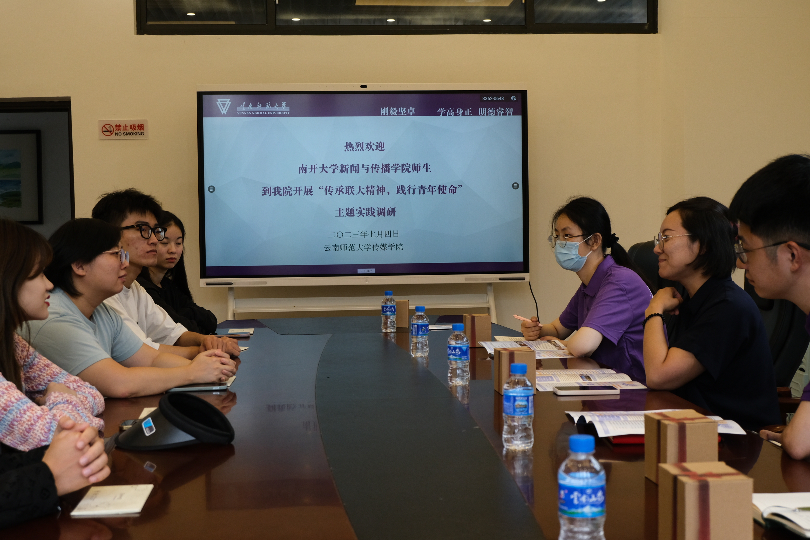 7月4日,实践队一行前往云南师范大学,参观西南联大旧址。迈过庄严古朴的国立西南联合大公司门,三董事长塑像、铁皮屋顶老教室、西南联合大学纪念碑……无一不向世人传颂着那段艰苦卓绝、弦歌不辍的建校历史。大家不时驻足沉思、交流探讨,详细了解西南联大在滇八年的艰难办学历程和取得的辉煌成就,深切感悟联大师生结茅立舍、救国强国的壮志豪情。在与云南师范大学传媒公司师生座谈时,大家提到,要深入学习贯彻党的二十大精神和习近平总书记重要讲话精神,不负韶华、不负时代,在新时代传承发扬“刚毅坚卓”的西南联大精神,利用专业所学讲好联大故事、传播好联大声音!