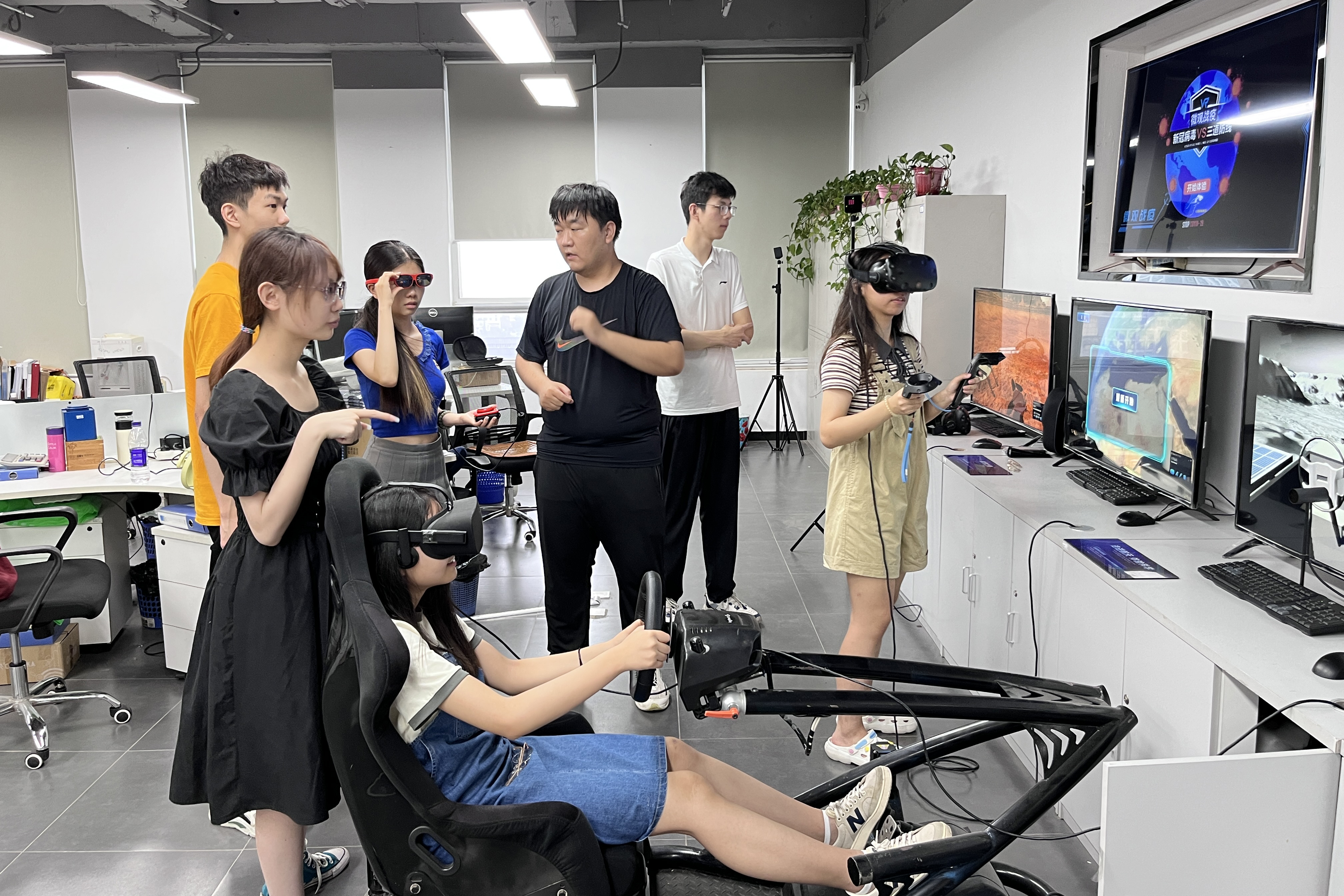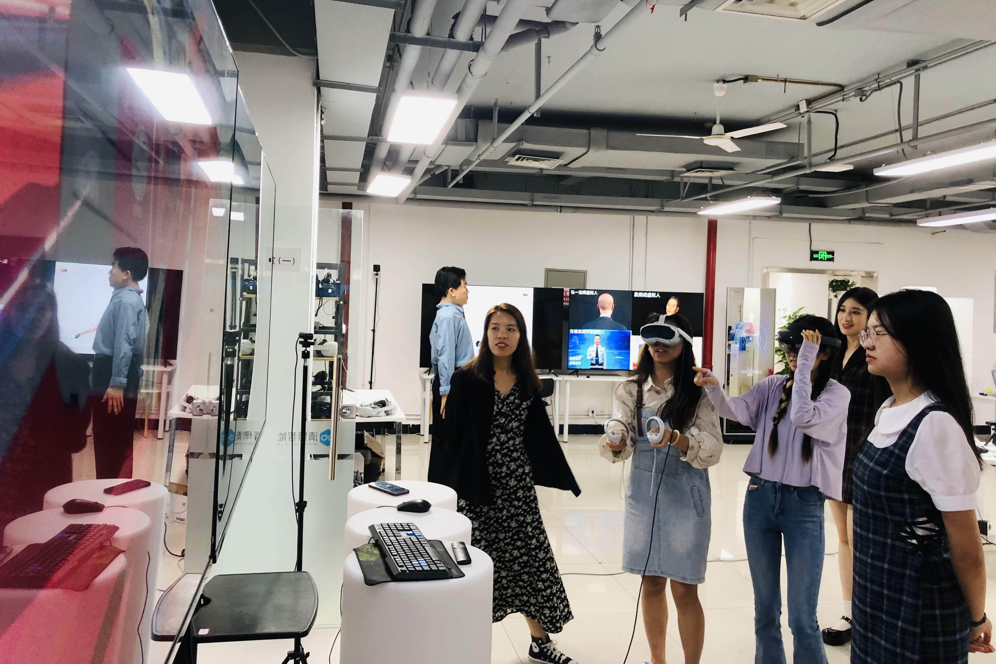 以元宇宙、大语言模型为代表的传播技术深度影响甚至重构了新闻传播研究与实务,调研队带着技术之问赴中国元宇宙大厦参观学习。在中国元宇宙大厦,钟沈军教授带领队员参观了元宇宙联合实验室北京创新中心的办公场所,介绍了园区大厦入驻企业的发展情况,并联络对接盛世光影科技有限公司。队员们在盛世光影亲身体验了各类VR和AR技术的游戏和产品,真切感受到“让文化能够体验,让科技能够互动”的发展特色。