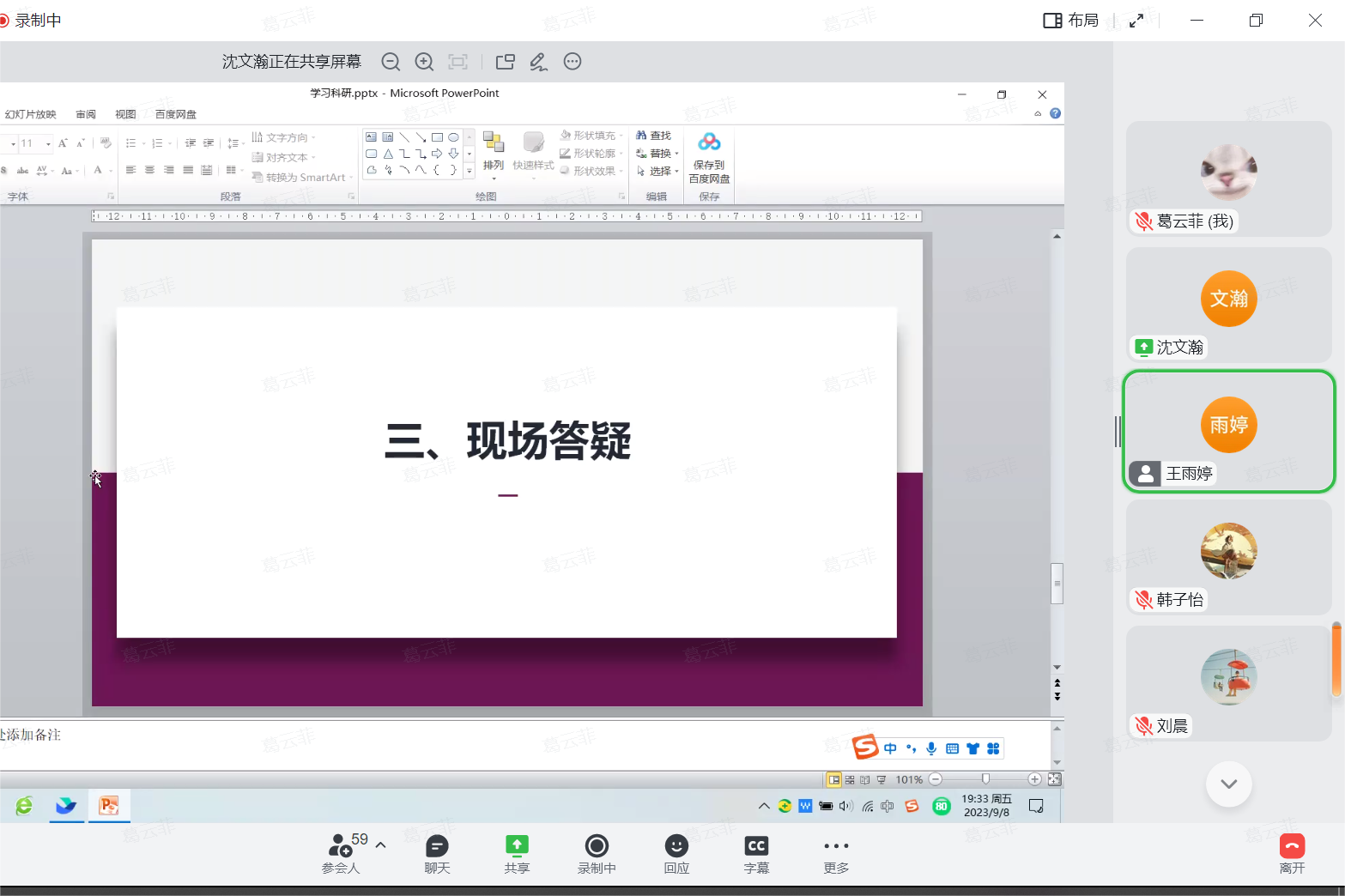 分享会前期,支部成员们提前收集研一新生的问题,力求结合一年来的实际生活尽可能为大家答疑解惑。会上,沈文瀚、杨柠瑜、葛云菲、燕新宇、王雨婷、刘甲等党员依次就学术科研、员工工作、实习实践和生活娱乐等四个方面与2023级硕士研究生新生进行了交流分享。在互动答疑环节,支部成员悉心解答了同学们提出的各种问题,并给出了有针对性的参考建议,现场反响热烈。新生纷纷表示此次活动全面细致,受益匪浅,更加明确了读研期间的学习目标和努力方向。