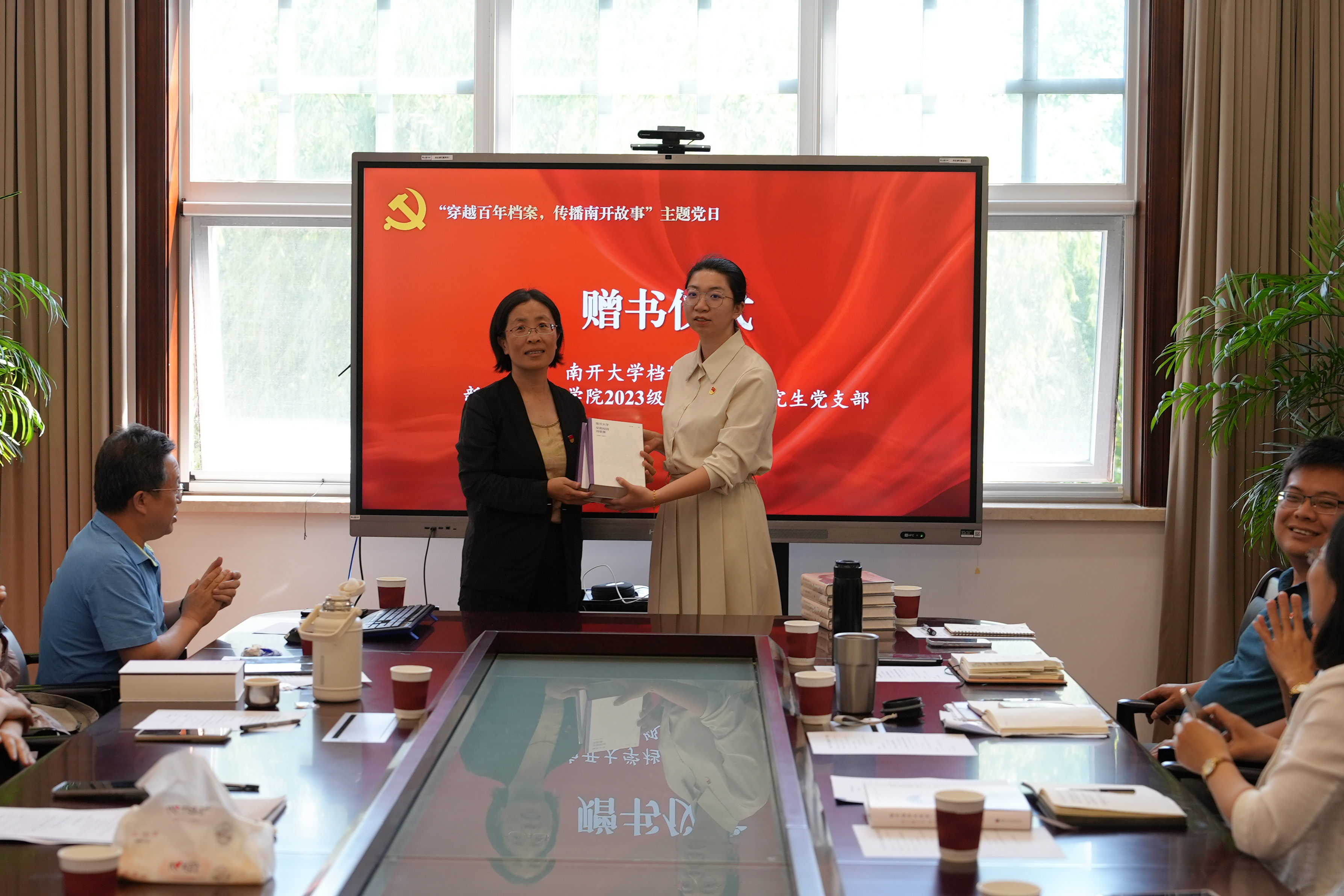 活动现场还举行了赠书仪式。档案馆党支部书记、馆长袁伟将《铅字流芳大先生——近代报刊中的张伯苓》、《Playace平台官网入口早期校园诗歌集(1919-1937)》郑重地赠送给新传员工,Playace平台官网入口2023级学术硕士研究生党支部书记王晓雅代表大家接受赠书。