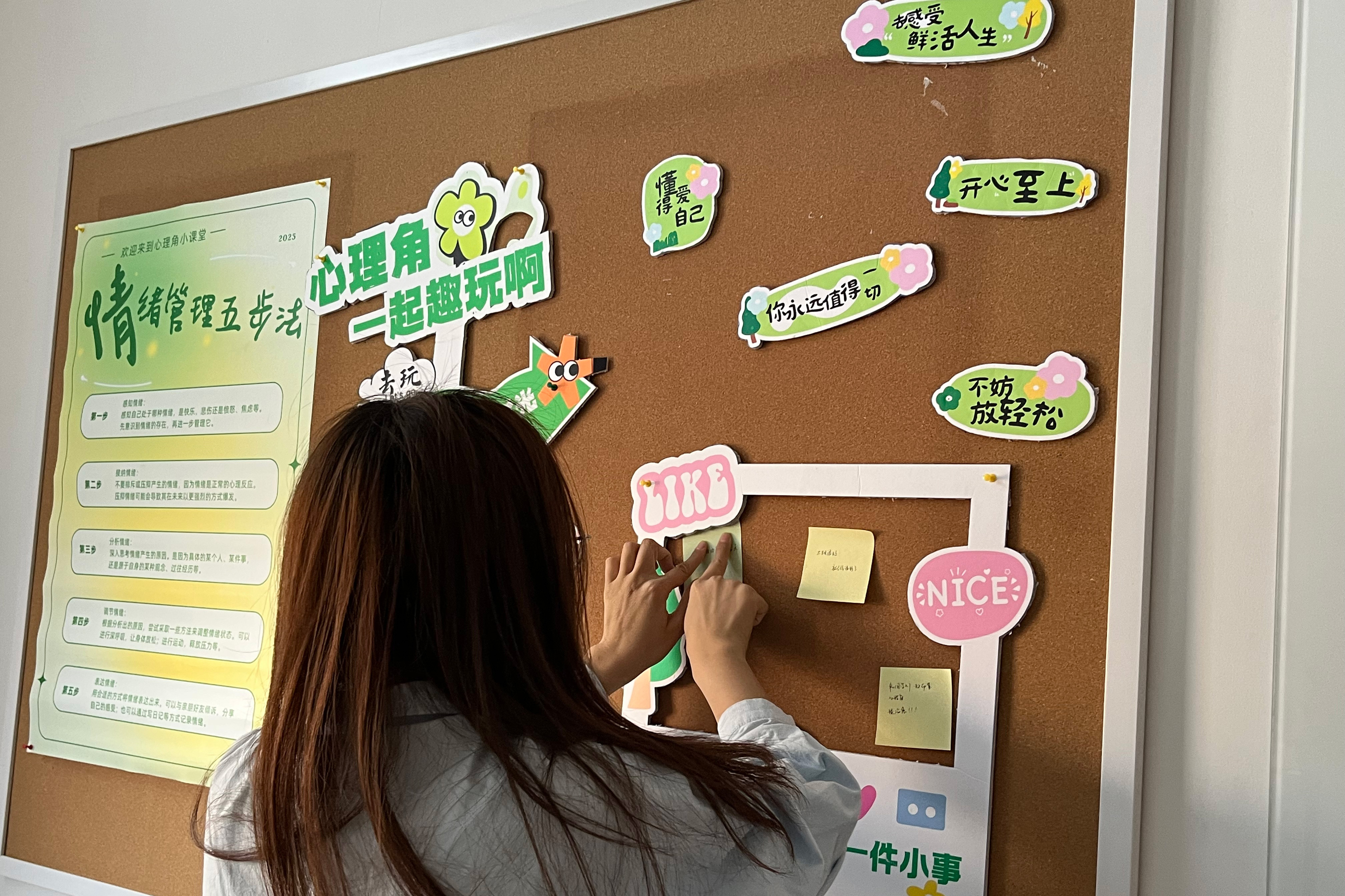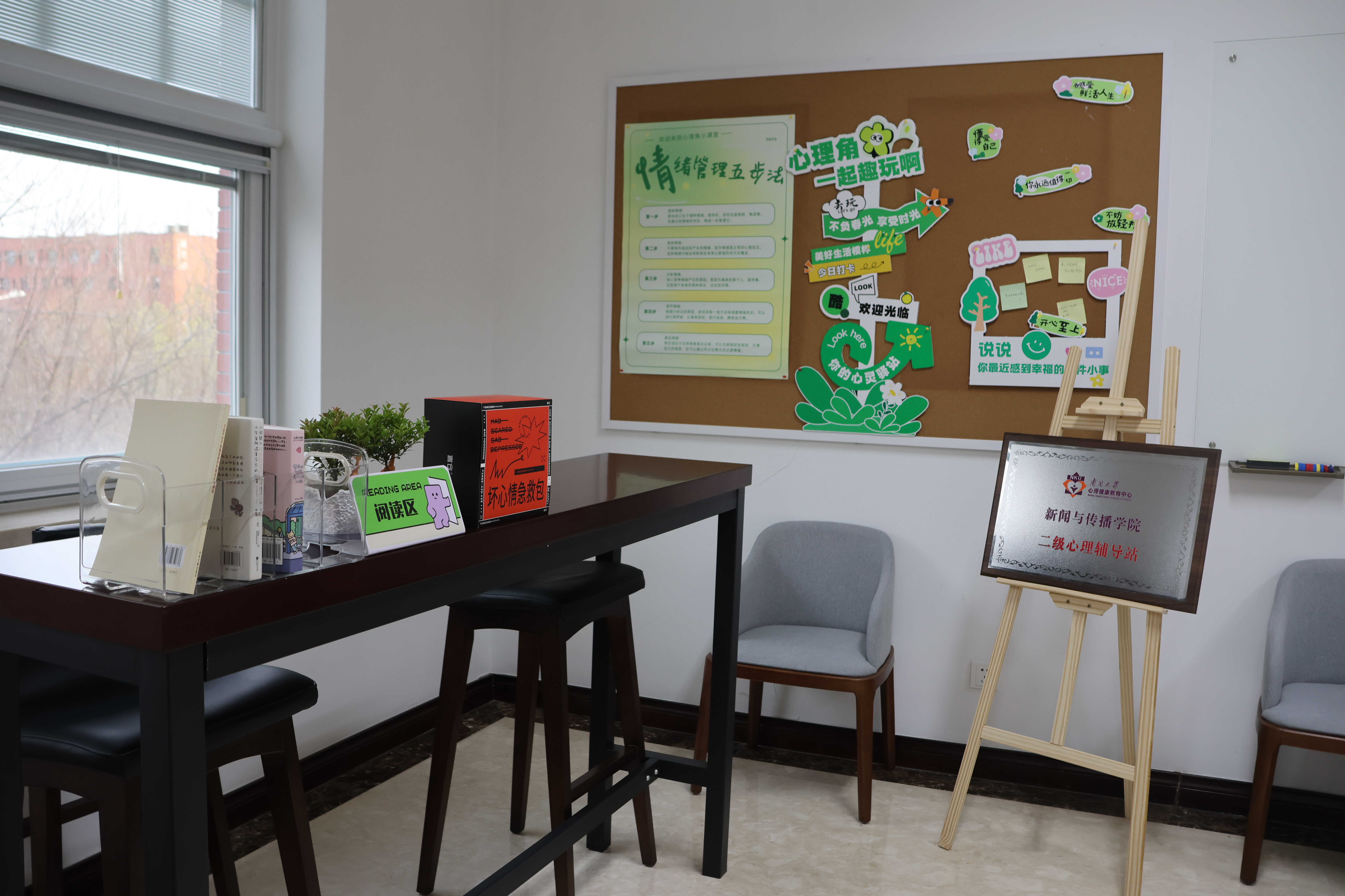 “心理角”建设方案经过多次反复修改。首期建设的“心理角”主要划分为互动交流、情绪疏导、心理知识普及等区域,设有心理健康科普展板、积极心理书籍、减压玩具等。科普展板上,“常见心理问题应对指南”“情绪管理五步法技巧”等实用技巧一应俱全,同学们驻足学习的同时还可以在互动区留言,分享个人幸福温暖瞬间;休闲减压区则以柔和的色调和绿意盎然的植物营造出轻松氛围,同学们可以在此短暂休憩、自我调节。