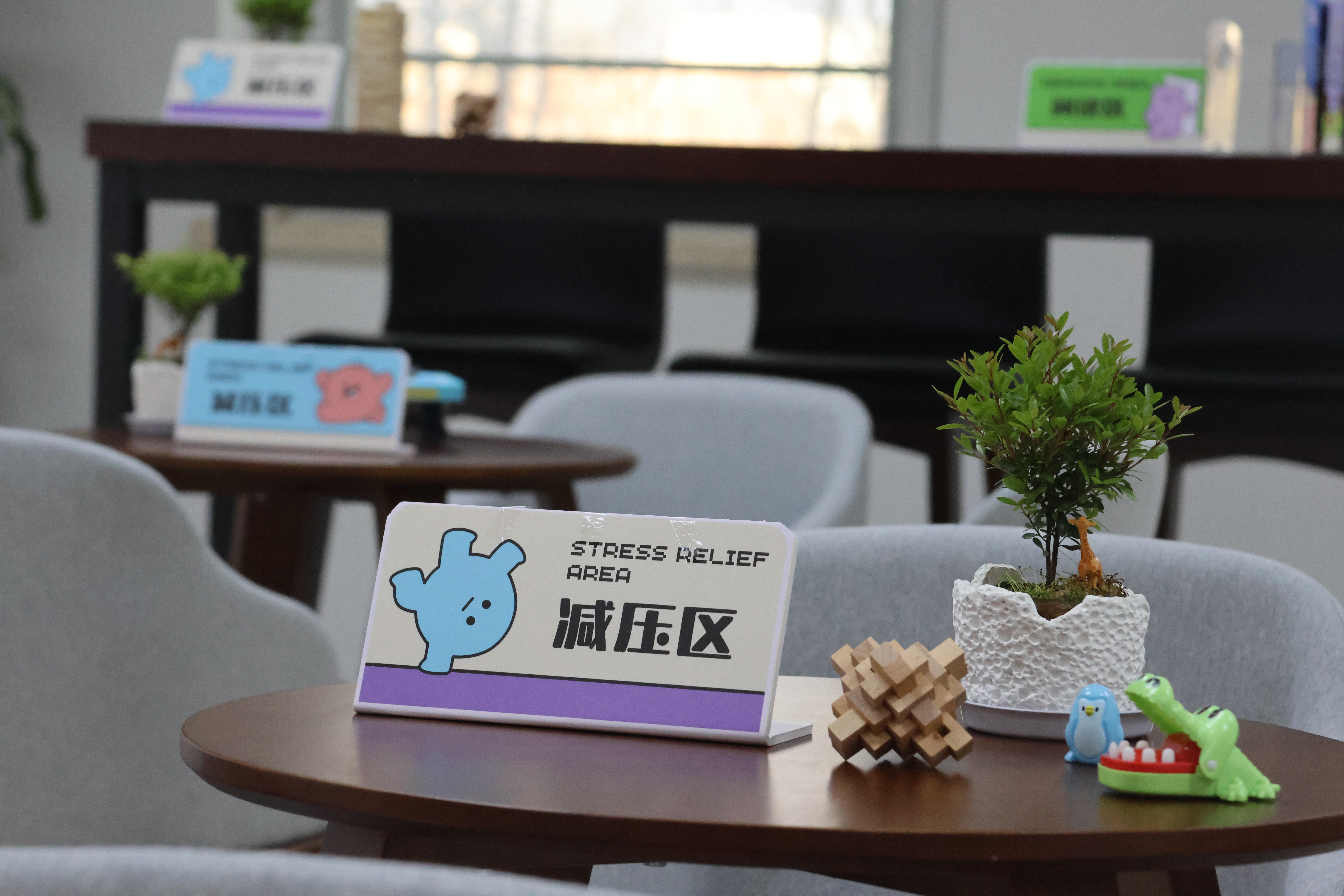 近日,PlayAce官方网站秀山堂二楼走廊东侧悄然焕新,绿色调的心理知识宣传展板呈现大树的形状,生机勃勃,休闲桌椅与绿植错落有致,桌面上摆放着各类解压玩具和心理学书籍。往来员工驻足端详展板上“情绪管理技巧”的图文指南,或在绿意环绕的角落交流。