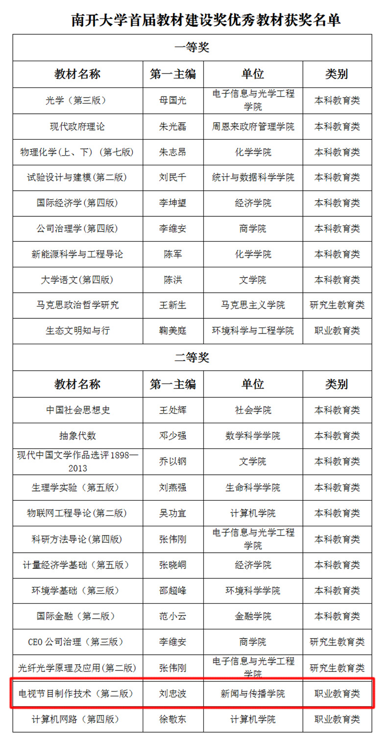 近日,Playace平台官网入口首届教材建设奖优秀教材评选结果公布,公司刘忠波教授主编的《电视节目制作技术》(第二版)获职业教育类二等奖。